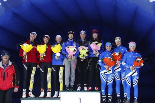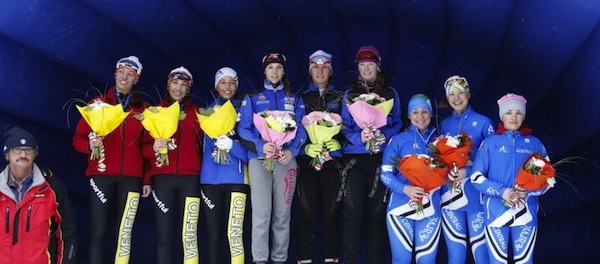 La piccola Valle d’Aosta è grande a Forni Avoltri con due ori nelle staffette allievi Forni Avoltri (UD) 15 marzo 2015 – Si chiudono i campionati italiani allievi con le prove a squadre e la piccola Valle d’Aosta è padrona in entrambe le categorie. Giornata caratterizzata da una lieve nevicata che in alcuni momenti si è fatta più intensa. Organizzazione esemplare frutto del connubio tra il Monte Coglians di Forni Avoltri e l’Asd Camosci di Sappada. Presente il consigliere nazionale Gabriella Paruzzi che ha assistito alla competizione e premiato le staffette in gara. Alle ore 9 partenza della categoria maschile sotto una fitta nevicata, è stato Daniele Fauner (Friuli Venezia Giulia) a prendere il comando e a dare il cambio per primo al compagno di squadra Giona Barbacetto, in 2° posizione ha cambiato il Trentino A con Davide Facchini che ha lanciato Riccardo Bernardi distanziato di una manciata di secondi, al 3° posto Davide Comensoli lasciava il testimone a Pietro Sosio e al 4° posto il Comitato Asiva con Jacques Lino Chanoine che dava il cambio al fratello Didier Dario. Al comando si formava una coppia di testa con il Friuli e il Trentino, ad inseguire ad una decina di secondi un terzetto formato dalle Alpi Centrali A, Asiva A e Friuli Venezia Giulia B. Barbacetto dava il cambio in prima posizione a Davide Graz, ma a pochi secondi ottimo il recupero dell’Asiva che affidava a Cedric Christille l’ultima frazione, al 3° posto le Alpi Centrali con Pietro Sosio che lanciava Angelo Buttironi tallonato dal Trentino A con Stefano Dellagiacoma. Al primo giro dell’ultima frazione un terzetto al comando con il Friuli a fare l’andatura seguito dall’Asiva e dalle Alpi Centrali, ultimo giro al cardiopalma con volata finale tra Christille e Graz con il valdostano che aveva la meglio sul sappadino al fotofinish, al terzo posto chiudeva Buttironi per le Alpi Centrali. Nella categoria femminile Emilie Jeantet per il Comitato Asiva andava subito al comando seguita da Valentina Maj delle Alpi Centrali A e da Manila Tribbia delle Alpi Centrali B. Emilie Jeantet dava per prima il cambio a Federica Cassol per l’Asiva, al 2° posto Valentina Maj lasciava il testimone ad Alice Antonioli davanti al Veneto A con Giorgia Rigoni che cambiava con Rebecca Bergagnin. Alice Antonioli per le Alpi Centrali allungava nell’ultima parte del tracciato e cambiava per prima lanciando Virginia Palazzi già vincitrice nella gimkana, al 2° posto il Veneto con la Bergagnin che dava il cambio ad Alessia Ponte De Zolt e al terzo posto l’Asiva con la Cassol che lasciava Noemi Glarey. Nel primo giro dell’ultima frazione il terzetto di testa si ricompattava, ma nell’ultima parte del tracciato la valdostana di Cogne Noemi Glarey faceva la differenza e andava in fuga, nuovo fotofinish per la seconda e terza piazza che dava ragione al Veneto A davanti alle Alpi Centrali A. Nella classifica per comitati i campionati italiani sono stati vinti dalle Alpi Centrali davanti al Trentino e al Friuli Venezia Giulia. Abbiamo assistito a tre splendide giornate fra Sappada e Forni Avoltri incorniciati dalle alpi dolomitiche della Carnia; fra qualche anno alcuni di questi atleti li ritroveremo a calcare le piste internazionali e a rappresentare l’Italia in Coppa del Mondo, è stata una grande festa di sport dove l’amicizia e la tenacia sono state le protagoniste.