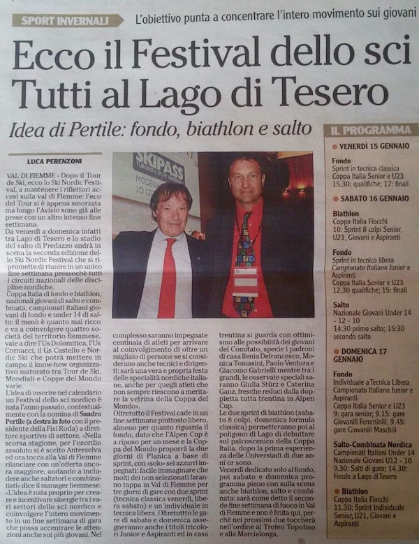 Nordic Ski festival: da venerdì a domenica 4 specialità in gara in Val di Fiemme. Un evento che vedrà in gara moltissimi giovani del fondo, del biathlon, del salto e della combinata nordica. Saranno assegnate medaglie dei campionati italiani delle categorie U18 e U20 dello sci di fondo, molte gare saranno valide come qualificazione per i mondiali juniores e U23 di Rasnov, in Romania, per i giochi Olimpici giovanili di Lillehammer, per le prossime tappe di coppa del Mondo.