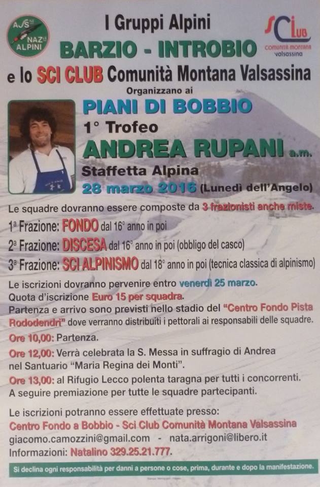 I Gruppi Alpini di Barzio e Introbio, e lo Sci Club Comunità Montana Valsassina, organizzano una staffetta Alpina in memoria di Andrea Rupani, il 28 marzo 2016 ai Piani di Bobbio (LC). Le squadre saranno composte da 3 frazionisti (un fondista, un discesista e uno sci alpinista). La partenza verrà data alle ore 10:00 presso il “Centro Fondo Pista Rododendri”.
